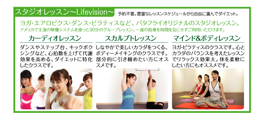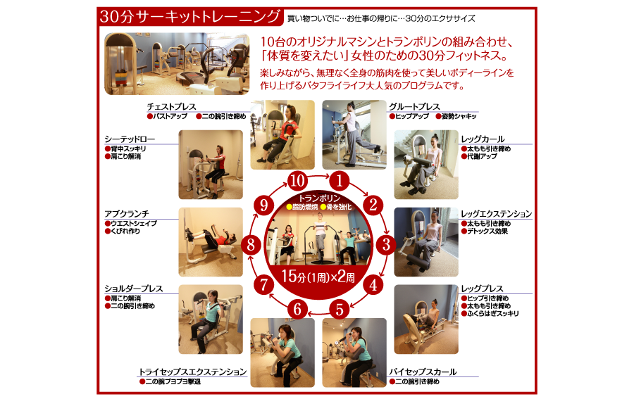 バタフライライフのサーキットトレーニングは女性のために独自にデザインされた30分フィットネス。楽しみながら、無理なく全身の筋肉を使って、カロリーを効果的に燃焼できるからだをつくる、まさに美と健康のためのベストプログラムです。